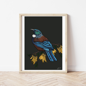 Tūī, one of Aotearoa’s most beloved native birds. With its iridescent feathers and iconic white throat tufts, the tūī is brought to life in vibrant detail. Titled Hello Old Man, this print celebrates the bird’s wise, watchful presence, a touch of nature and nostalgia to brighten any space.
