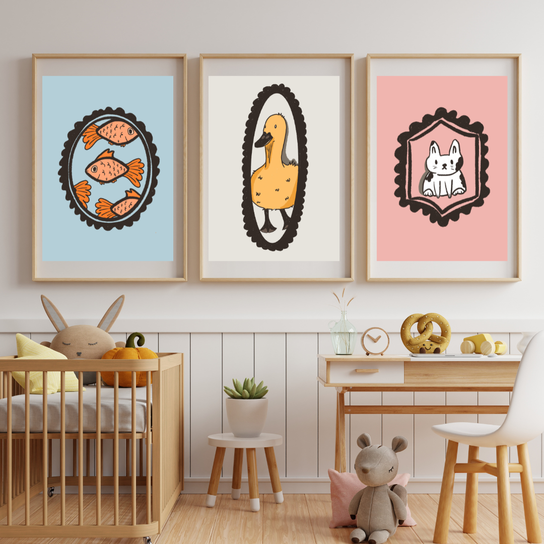 Designs are available as A5, A4 & A3 art prints, printed on 210gsm acid free paper with enhanced matte finish—each with a small white border around the design.